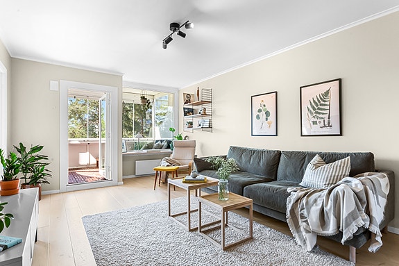 Lys og pen 3-roms leilighet, med peis og innglasset, vestvendt balkong. Grønt og frodig utsyn! Skjermet beliggenhet.