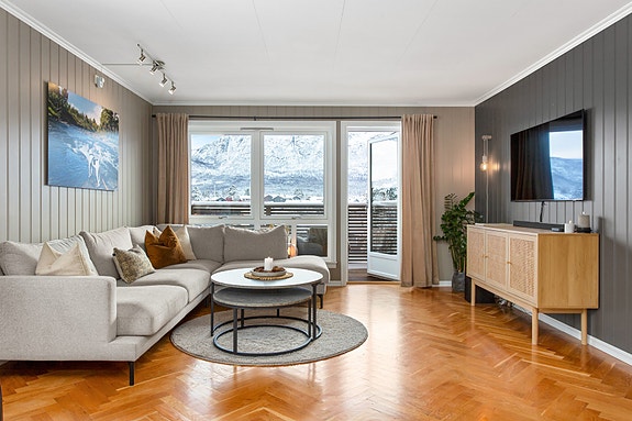 Leiligheten som ble bygget ut og pusset opp mellom 2012-2015 har en effektiv planløsning og god standard. Den har en delikat kombinasjon mellom klassiske elementer som slipte originale tregulv og vedovn og friske, moderne fargevalg og innredning.