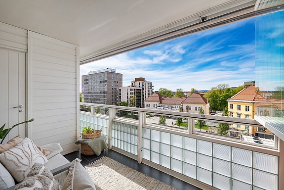 Leiligheten oppleves meget romslig med gode romstørrelser, store vindusflater og en helt fantastisk balkong på 9 kvm. Nydelig utsikt, optimale vestvendte solforhold og ingen innsyn gjør balkongen til den ideelle uteplass. Balkongen er i tillegg innglasset og kan av den grunn brukes store deler av året. Leiligheten har pene overflater, fornyet elektrisk anlegg og kjøkken og bad fra 2005.