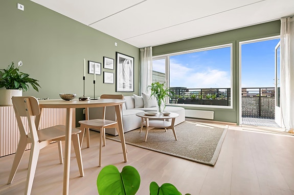 Leiligheten ligger høyt og fritt til i byggets 6.etasje med heis. Her får du en svært god planløsning med store vindusflater og en fantastisk romfølelse.