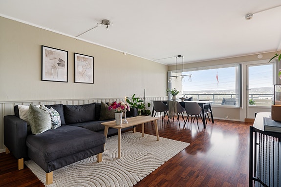 Tunet beskrives som rolig med lite trafikk, interne gangveier, lekeplasser og grøntområder like utenfor døra. Leiligheten ligger skjermet til i tredje etasje og nyter fantastiske sol- og utsiktsforhold.