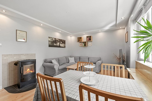 Koselig stue med peis, perfekt for kalde vinterkvelder.