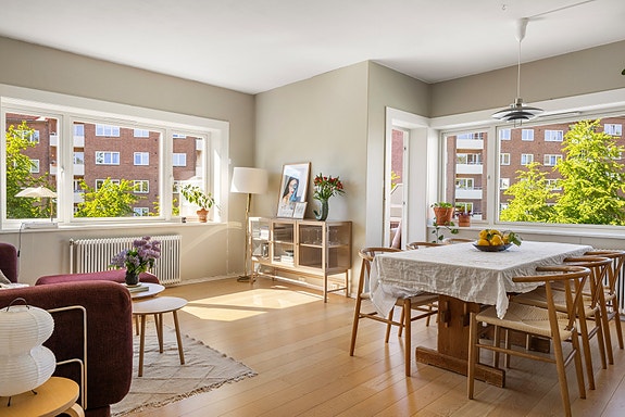 Lys 3-roms hjørneleilighet med gjennomgående planløsning og solrik vestvendt balkong på ca. 7 kvm |v.vann/​fyring inkl.