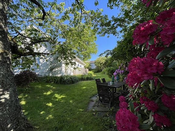 Spennende hage med masse blomster, fuglebad, og koselige uteplasser under eldre frukttrær.