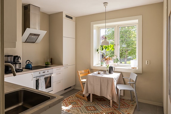 Lys og romslig 3-roms med frodig parkareal som omringer blokken. Stue med tilgang til sørvendt balkong med utsyn mot idylliske fellesareal og svært gode solforhold. Vedovn fra 2019 og plass til sofasone og spiseplass. Separat kjøkken fra IKEA med spiseplass ved vindu. Bad oppgradert i regi av brl, med opplegg for vaskemaskin. To gode soverom med plass til dobbeltseng. Hovedsoverom har skyvedørsgarderobe på hel vegg. Ny parkett på gulv fra 2019 og slette malte vegger. Utskiftning av sikringer i el-anlegg i 2019. Ekstern lagringsplass i tre boder.