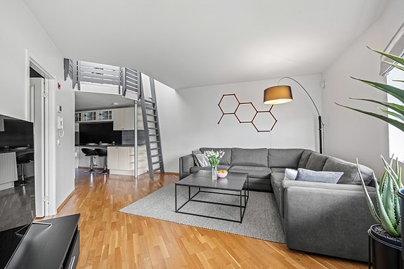 Stor 2-roms på 57 kvm + hems på 25 kvm(ikke målbar 1,7 m takhøyde). Balkong - garasjeplass. Gåavstand til Lillestrøm.