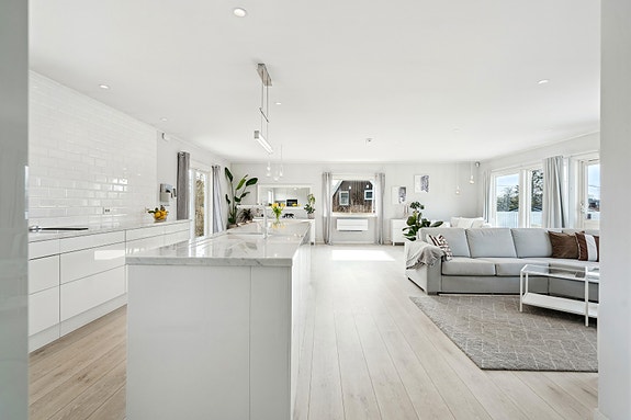 Stuen har god plass til både sofagruppe og spisebord, og har direkte utgang til begge uteplassene. Kjøkkenet, som ble pusset opp i 2018, har moderne løsninger, god skapplass og en praktisk kjøkkenøy. Soverommene er romslige med god garderobeplass, og badet er funksjonelt innredet.