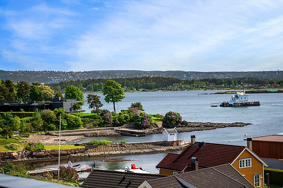 - Stor terrasse på ca. 78 m2 med imponerende utsikt mot fjorden, innseilingen og Dyna fyr, samt en hyggelig terrasse ved inngangspartiet på ca. 32,5 m2. Fra to av soverommene i andre etasje er det også utgang til en vestvendt balkong på ca. 17 m2 hvor utsikt er om mulig enda flottere.