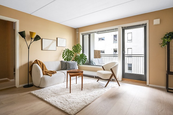 Lys og moderne 3-roms. Solrik balkong. Fyring/varmtvann inkl. Heis. Felles takterrasse. Nymalt. Parkett fra 2025.