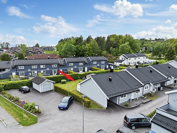 Tagtvedt/Bekkefaret - fint beliggende enderekkehus med alt på en flate, flotte uteplasser, hagestue og solrik, skjermet hage. Carport.