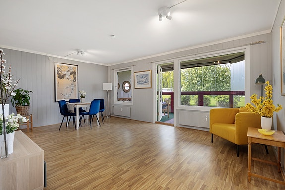 Stor 2-roms leilighet i 1.etg. med innglasset balkong med ettermiddagssol. Glassene på balkongen kan skyves tilside for en mer åpen løsning på varme sommerdager. Store vinduer med fritt utsyn til det åpne området foran blokka og med begrenset med innsyn.
