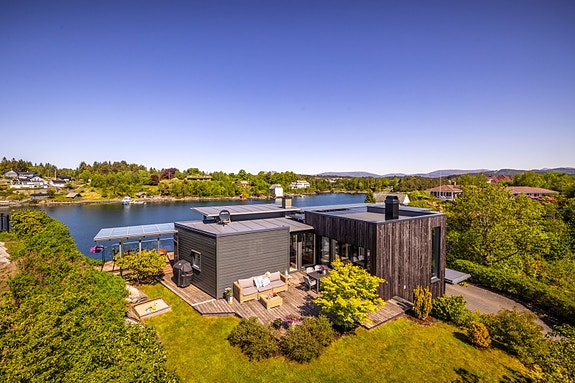 Arkitekttegnet enebolig i sjøkanten | strandlinje og båtplass | solrikt og barnevennlig