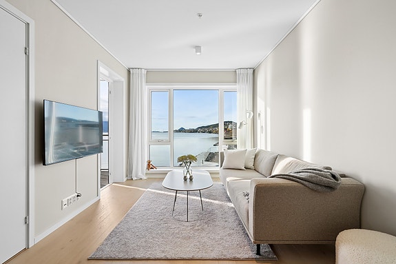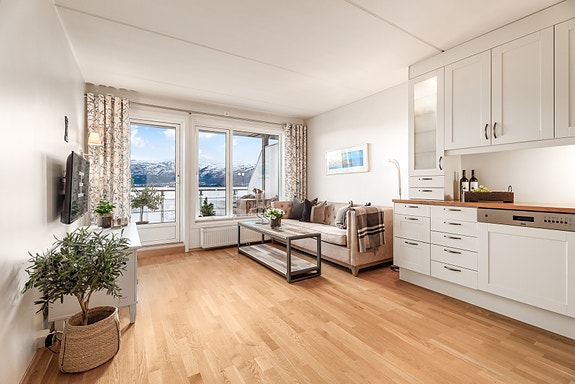 . Åpen stue- og kjøkkenløsning med store vindusflater