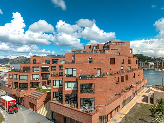 Innhold: Stue med kjøkkenøy og utgang til stor terrasse med gode solforhold, 2 soverom, garderoberom, 2 bad, gang og bod i kjeller. Fast parkeringsplass i lukket park-anlegg med heis opp til leilighet. Det er felles sykkelboder, sykkelverksted og sykkelvaskerom i kjelleren, 6 store felles terrasser med flott utsikt.