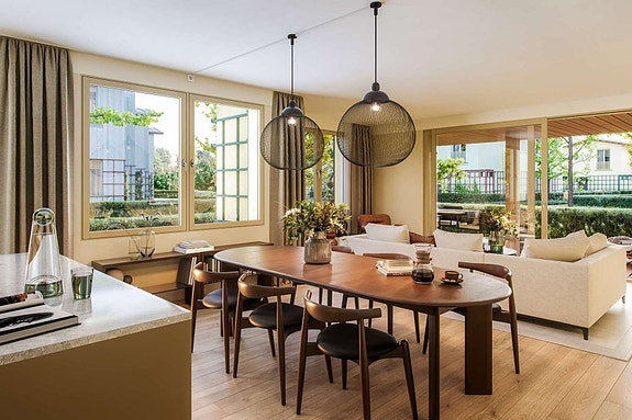 Gangavstand til alt av fasiliteter og servicetilbud, samtidig tilbaketrukket som en grønn oase med svært flotte fellesarealer.