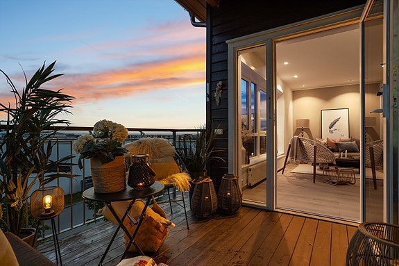 Stilfull, lekker og nyoppusset toppleilighet med solrik balkong. Fjernvarme inkl. i felleskostn. Heis. Egen garasjeplass
