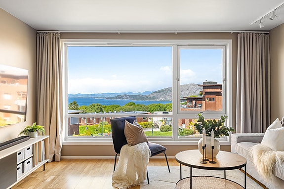 Flott leilighet med nydelig og vidstrakt utsikt. 2 balkonger. Heis. Parkering i lukket anlegg.