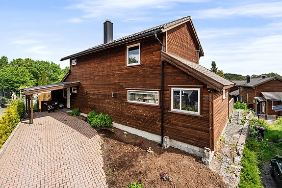 Innholdsrik enebolig over to etasjer med fin planløsning - 3 soverom - nyere kledning, vinduer - påbygd terrass -garasje