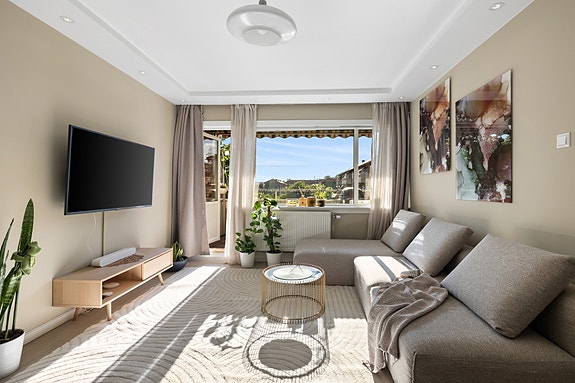 Gjennomgående 4-roms m/vestvendt balkong på 7 kvm. Nye overflater i 2024. Kjøkken fra 2018. Vv/fyr. inkl. Garasjeplass!