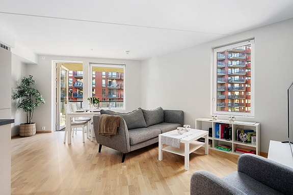 Moderne 2-roms leilighet fra 2024 m/stor balkong. HTH kjøkken. Fjernvarme & bredbånd inkl. IN-ordning. Takterrasse.