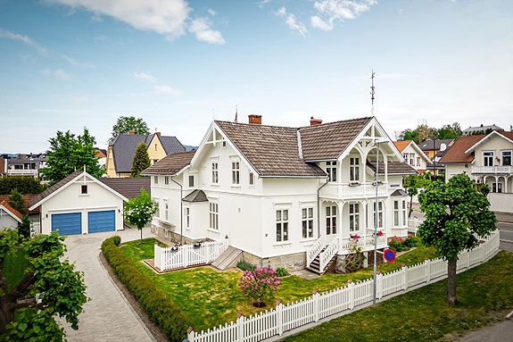Velkommen til en unik og historisk villa, som bærer med seg både sjel, sjarm og historie. Denne praktfulle eiendommen ble oppført i 1889 av byggmester Svend Sigurdsen, og representerer en sjelden kombinasjon av arkitektonisk eleganse og kulturell betydning. Villaen er et prakteksemplar av en Sveitservilla, med tidstypiske detaljer som originale stukkaturer, høye tak, doble dører og forseggjort listverk. Boligen er registrert som en hel tomannsbolig og har flere bruksmuligheter. Plan og skjermet hjørnetomt, vakkert opparbeidet og beplantet med en frodig hage som gir en idyllisk og privat atmosfære. I tomtegrenser er det oppført høyt gjerde som skjermer godt for innsyn og utgjør en flott ramme rundt boligen. Her bor man sentralt til med gangavstand til alle sentrumsfasiliteter. Må oppleves!