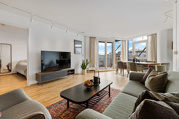 Leiligheten ligger i 8. etasje og inneholder entré, stue/kjøkken, tre soverom, to bad og omkledningsrom.