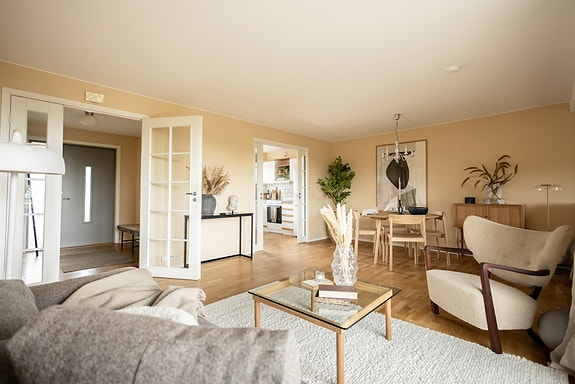 Lyst og trivelig | Opprinnelig 3-roms, nå flott 2-roms med solrik balkong, utsikt, garasje, trimrom m.m. For deg 50+