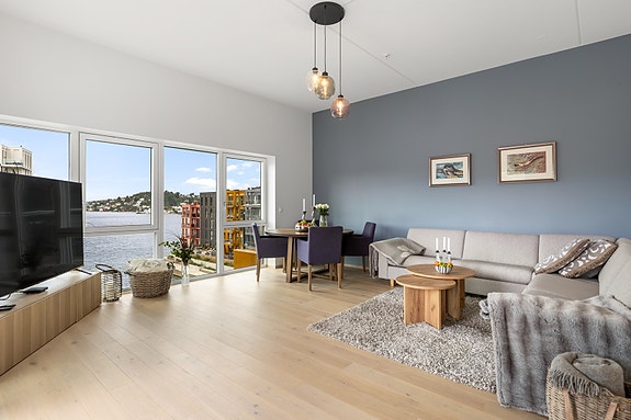 Moderne leilighet i 5. etg. med god standard og ekstra takhøyde (ca 3 meter). Leiligheten inneholder entrè, bod, 3 soverom, 2 bad, stue og kjøkken. I tillegg er det sportsbod i byggets underetg., samt romslig parkeringsplass med elbillader. P-plassen ligger nærmest døren i p-kjeller, uten andre biler på ene siden. Vannbåren varme sørger for god og lun oppvarming. Leiligheten har en fantastisk beliggenhet i øverste etasje på enden mot Tromøysund. Med vinduer på 3 sider, har du utsyn til yrende båtliv i Tromøysundet, ned i Lillepollen og videre innover mot byen. Her har du de aller beste solforhold fra morgen til kveld, med sol på svalgangen like utenfor leiligheten grytidlig om morgenen, og på den romslige terrassen utenfor kjøkkenet kan du nyte solen og utsikten fra morgen til kveld.