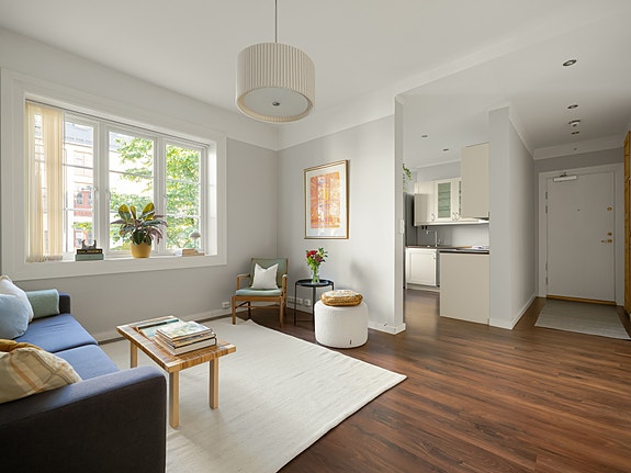 Dette er en gjennomgående og lys 2-roms, fint beliggende i byggets 2. etasje. Takhøyden og de store vinduene bidrar til både lys, luft og en god romfølelse i alle rom. Hele leiligheten vender mot den frodige bakgården, med unntak av soverommet, som vender mot rolige, enveiskjørte Omsens gate. Her er det altså primært fuglekvitter i monitor, samtidig som trikk og buss er et lite kvartal unna.