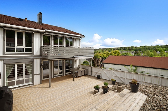 Familievennlig 4-roms med vestvendt terrasse på 43kvm. Garasje. Flotte uteområder. Hyggelig boområde rett ved Østmarka!