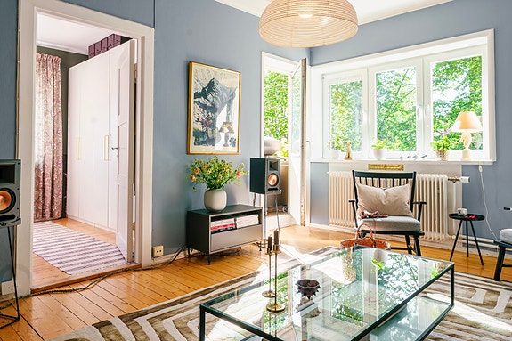 Leiligheten er romslig med gode innvendige lysforhold. Klassiske detaljer som; store vindusflater med brede vinduskarmer, originale tregulv, lys-innslipp fra boligens tre sider kombinert med moderne farger gir en varm og innbydende atmosfære.