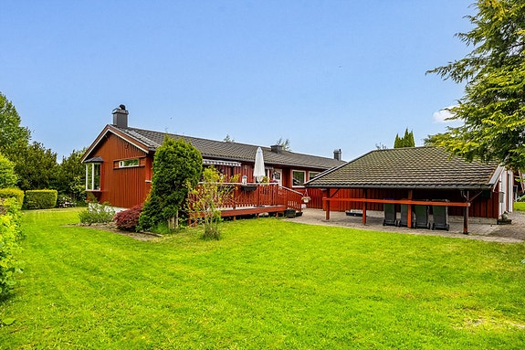 Eiendommen tilbyr også svært gode parkeringsmuligheter med både garasje, carport og i egen gårdsplass.