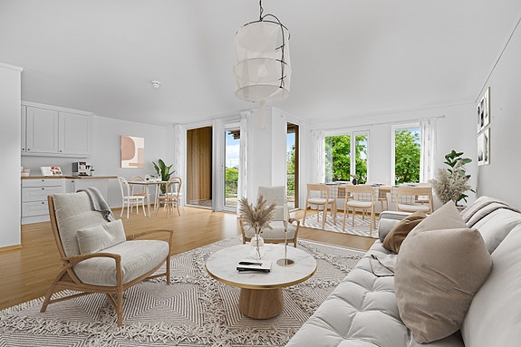 Velkommen til Kirsten Flagstads vei 13, stuen har en god plass til både spisebord og tvkrok (digitalt stylet)