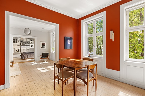 - Stukkatur, rosett, doble fløydører og originale tregulv