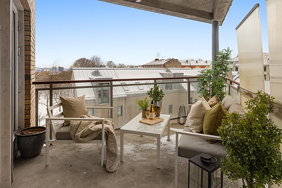 Fra stuen er det utgang til en hyggelig, solrik, sydøstvendt balkong, perfekt for morgenkaffen, rolige kvelder eller små sammenkomster med venner.