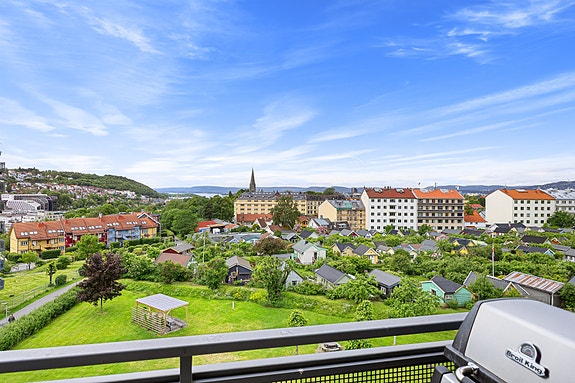 Betydelig påkostet 2-roms i 6. etasje med fantastisk utsikt. Garasjeplass m/el. Solrik balkong. V.vann, fyring ink.