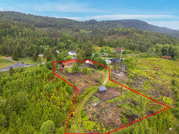 Tomten er solrik og boligen ligger pent til på en liten høyde bak gamle butikken. Her er det gode solforhold, fritt utsyn og usjenert. Tomten er stor og det er muligheter for å ha dyr på hobby basis på eiendommen.