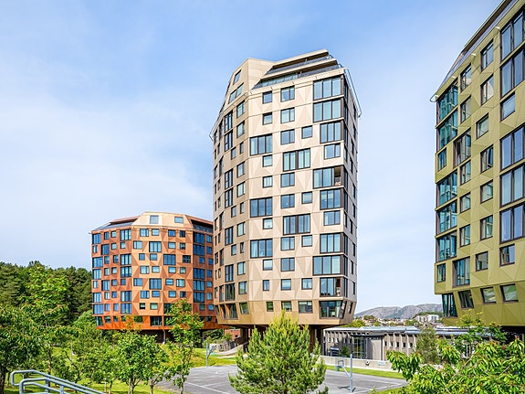 Denne fantastiske toppleiligheten byr på vakker og langstrakt utsikt i alle himmelretninger, og med fire terrasser har du alltid sol, skygge eller le etter eget ønske. Herfra ser du både fjord, fjell, by og hav!