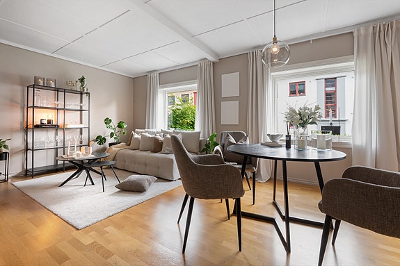 Nydelig 2-roms med vedovn i stuen, ekstra loftsrom, 3 eksterne boder og koselige uteområder. Kort vei til buss!