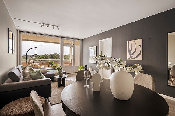 En stilfull og moderne leilighet beliggende i byggets 13. etasje. Her bor du høyt og fritt med fantastisk utsikt, gode solforhold og heis i bygget.
