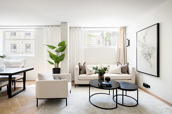 Velkommen til Uranienborgveien 29, en nyoppusset og svært tiltalende 2½-roms selveierleilighet. Leiligheten ligger i en høy underetasje og har gjennomgående planløsning, gode vindusflater og to innganger, den ene direkte fra en passasje på siden av bygget. Leiligheten holder en høy standard med stilig materialvalg, fiskebensparkett i alle oppholdsrom, listefrie himlinger og lekre, sorte detaljer.