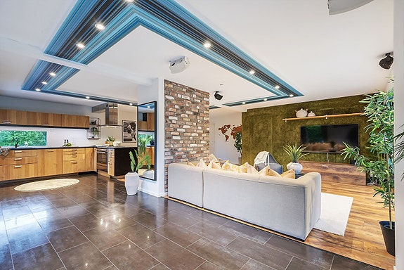 - Gulv med laminat og gulvbelegg.