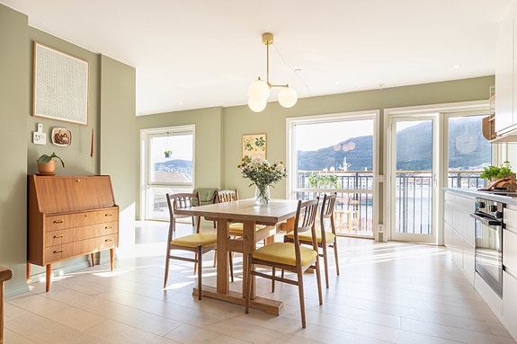 I C. Sundts gate 66 får du det beste fra to verdener - fredelig og maritimt, men samtidig tett på byens puls. Du bor i grønne omgivelser med lukten av sjø, synet av båter og byfjellene som endrer seg med årstidene. Herfra er det kort vei til Nordnesparken, sjøbadet, Verftet og sentrum. Leiligheten i 4. etasje nås enkelt med heis, og byr på moderne kvaliteter fra 2020, optimal planløsning og store vindusflater mot Vågen - med utsikt til Fløibanen, Fløyfjellet og Sandviken. De doble glassdørene åpner stuen mot balkongen. Kjøkken og stue ligger naturlig plassert i front, mens gang, to soverom og bad ligger rolig tilbaketrukket. HTH-kjøkken, moderne fargevalg, en-stavs parkett, fjernvarme og balansert ventilasjon. I tillegg har bygget to felles takterrasser med sol fra morgen til kveld.