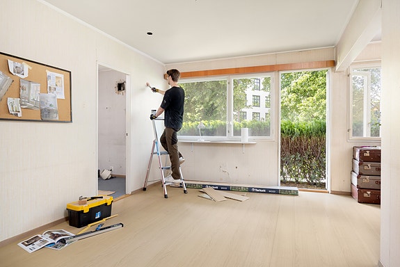 2-roms oppussingsobjekt med stort potensiale! Solrik markterrasse på 12 kvm. *Parkering. Lave felleskostnader.