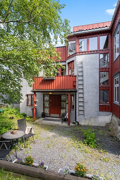 Boligen har en privat bakhage/bakgård med litt beplantning og tre.