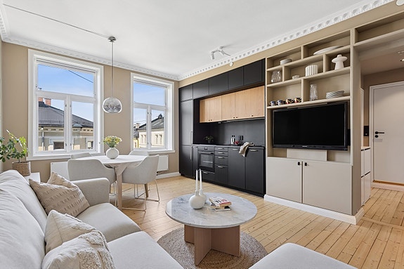 Velkommen til Conradis gate 1A - En lys og påkostet 2-roms eierleilighet beliggende i en klassisk, vakker bygård fra 1895. Her bor du med koselige kaféer, butikker og restauranter innen gangavstand, samt med noen av byens mest populære parker rett rundt hjørnet. Leiligheten har klassiske detaljer som stukkatur, store vindusflater, originalt tregulv og god takhøyde opp mot 2,79 m som gir et sjarmerende og luftig preg.