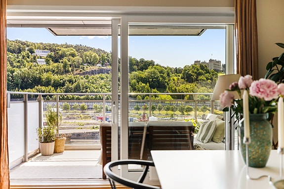 Her bor du tilbaketrukket i en høy etasje med to solrike balkonger og en fransk balkong som gir deg unike muligheter til å nyte solen fra tidlig morgen til ettermiddag - året rundt - med en fantastisk utsikt over fjorden og nærområdet. Her kan du virkelig kjenne på følelsen av å bo i sjøkanten, med tilgang til både badeplasser, promenade, grønne parker og hyggelige spisesteder rett utenfor inngangsdøren.