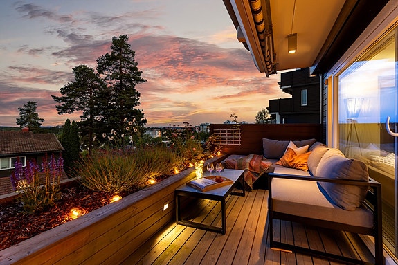 Lekker, gjennomført og moderne 4-roms med solrik terrasse på 12 kvm - Nydelig utsikt - Garasje - 2 bad - Barnevennlig