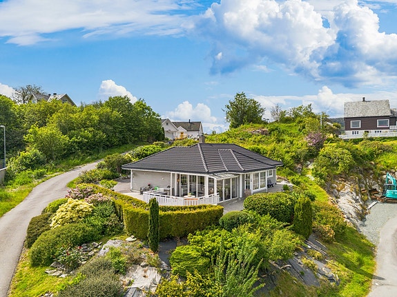 Idyllisk enebolig med flott utsikt og sjønær beliggenhet i barnevennlig område. Alt på ett plan. Vinterhage på 18 kvm