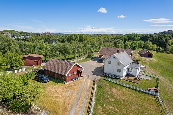 Enebolig, fritidsbolig (bruksendret fra driftsbygning), garasje, bobilgarasje, hønsehus, stall og støl.